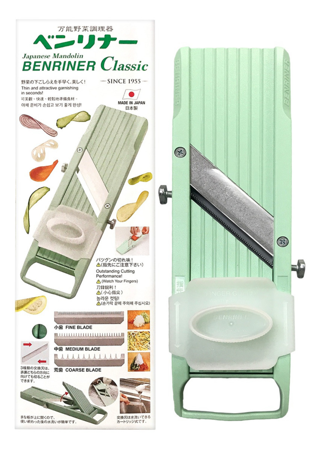 O fatiador produzido pela empresa japonesa Benriner foi desenvolvido para atender às mais altas necessidades de qualidade e segurança desde um chef profissional até um cozinheiro iniciante.