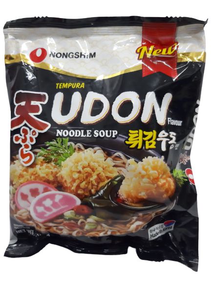 O macarrão instantâneo sabor Udon Tempurá tem o caldo é a base de peixe e com flocos de massa de peixe.